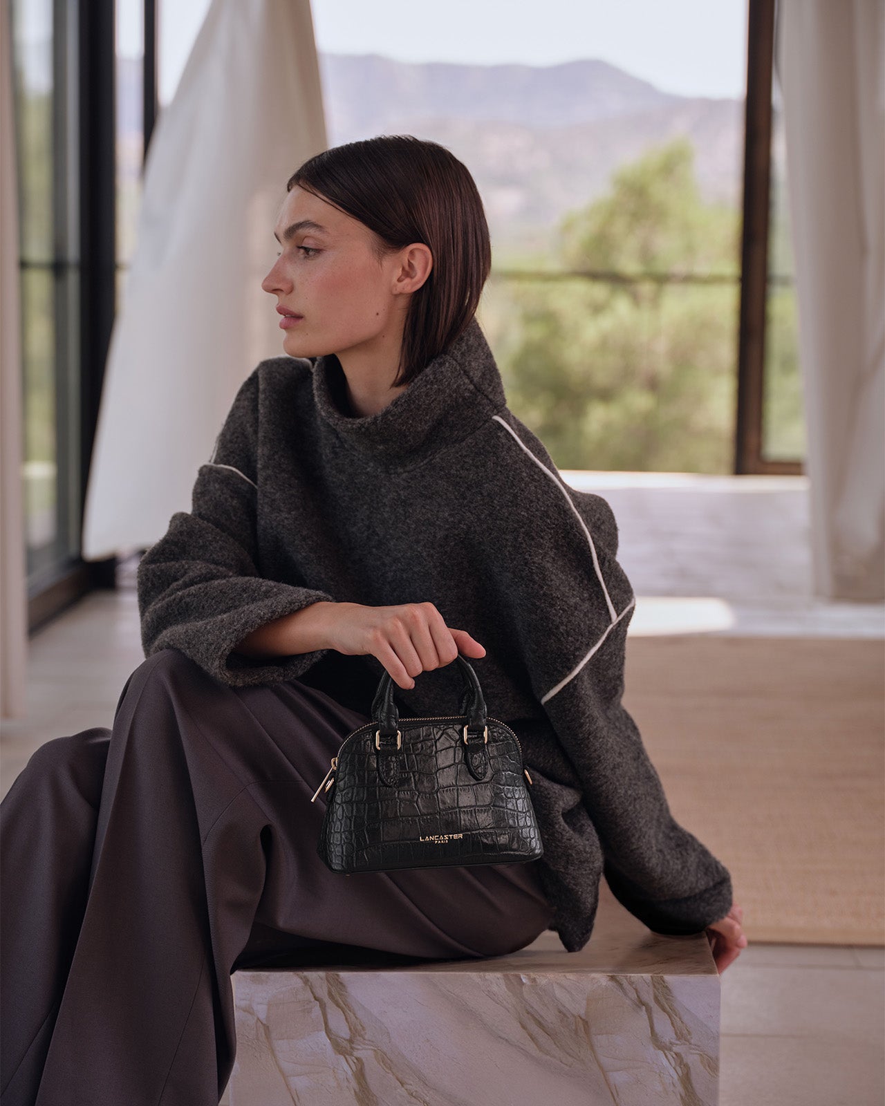 In einem skulpturalen Dekor erstarren die Silhouetten in kontrollierter Eleganz. Im Mittelpunkt stehen großformatige Modelle aus zeitlosen und widerstandsfähigen Materialien. Jedes Stück ist von subtiler Geometrie und präzisen Verarbeitungen inspiriert. Stillness in Stone offenbart die Sanftheit des Winters durch Lederwaren, die Know-how und Eleganz vereinen.